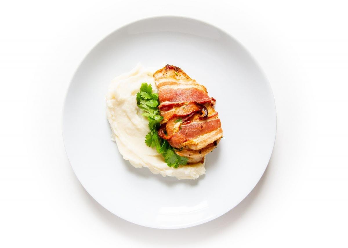 Savor our “Bacon-Wrapped Chicken Breast”, featuring with Cauliflower Purée and Spinach. Created by Chef Tony Perez, it boasts an impressive 4.20-star rating and around 730 kcal per serving.. Please note it contains or may contain: Milk
